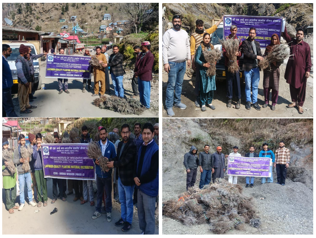 On 25.02.2026, CSIR-Indian Institute of Integrative Medicine Jammu organized a Lavender (QPM) distribution and awareness programme for farmers in various villages of Ramban District under CSIR-Aroma Mission Phase-III. The programme aimed to promote lavender cultivation as an income-generating crop and to create awareness among farmers about its scientific cultivation practices, economic benefits, and marketing potential. During the programme, a total of 50,400 Quality Planting Material (QPM) of lavender was distributed among 39 beneficiary farmers across different villages of the district.